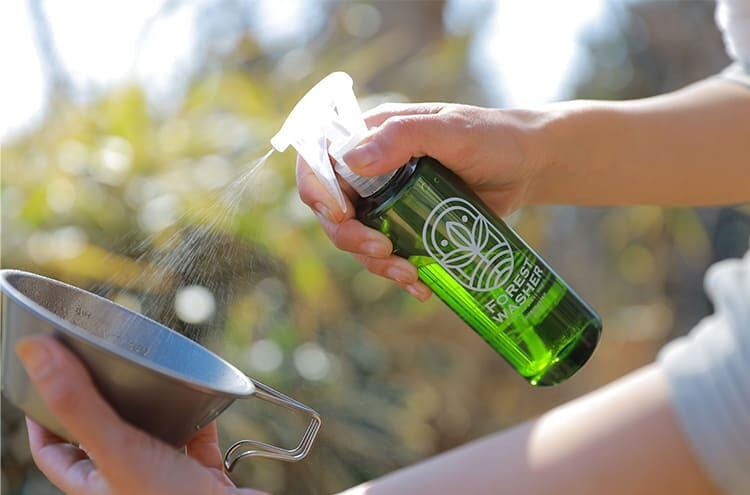 水が無い場所で食器や調理器具に噴霧し、汚れを拭き取る