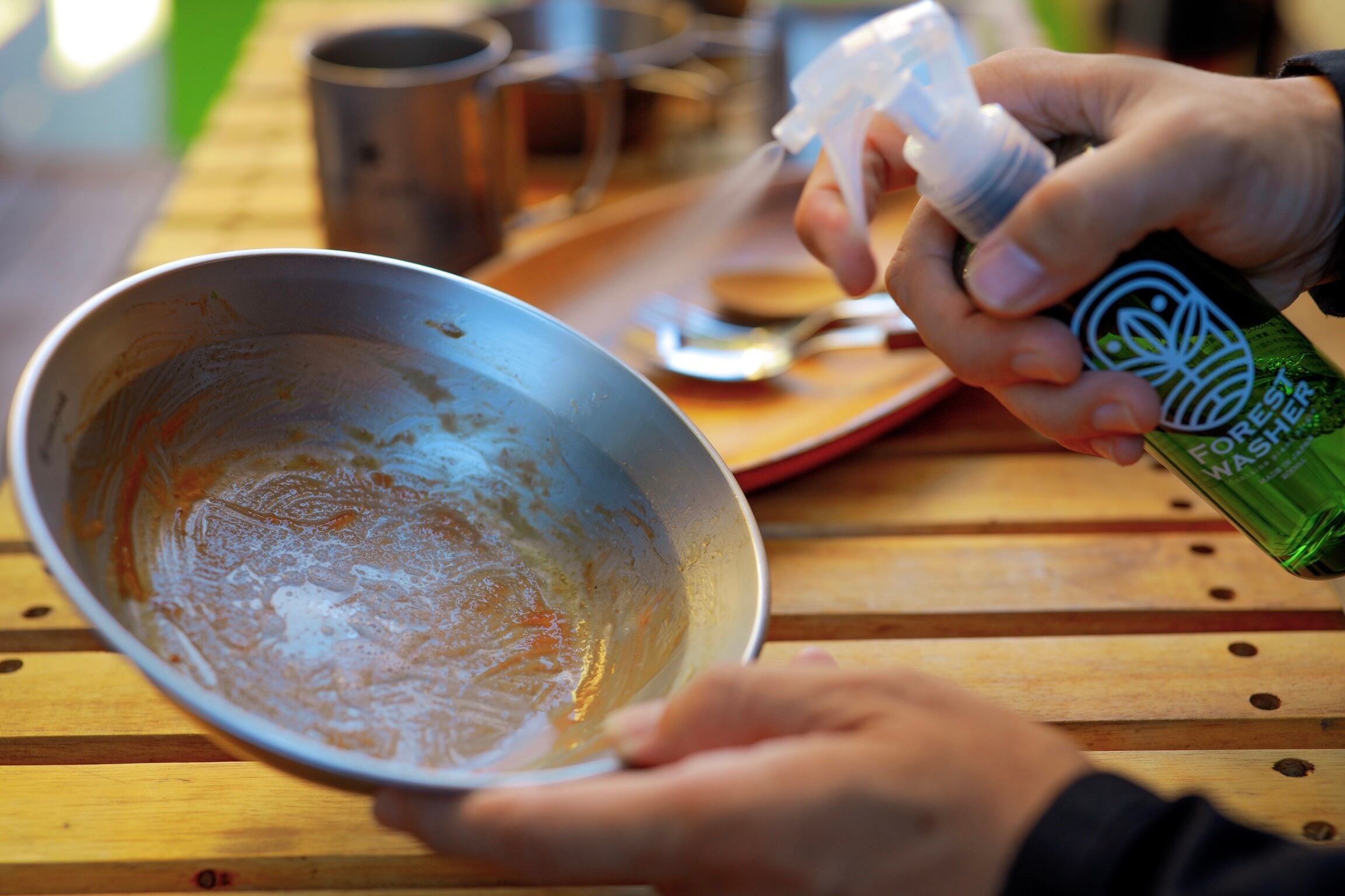 水が無い場所で食器や調理器具に噴霧し、汚れを拭き取る